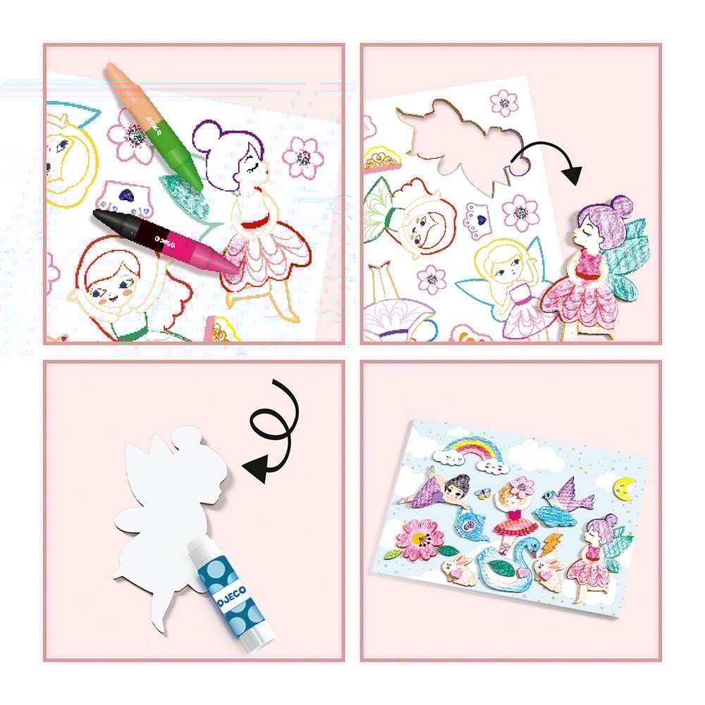 un monde à créer, une multitude de formes, de grands décors, 8 couleurs, de la colle pour créer comme on veut. le livret donnera des idées.